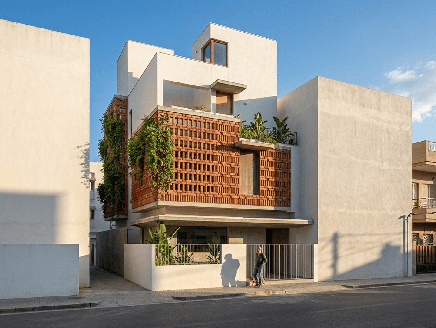 Bedrooms are designed to receive maximum natural light while maintaining privacy through a double-layered façade of brick screens and glass, with creepers and plants in between. This green buffer acts as thermal insulation and helps reduce heat gain, making the house comfortable throughout the year.