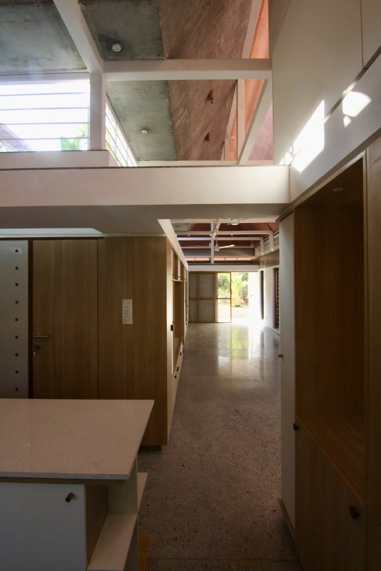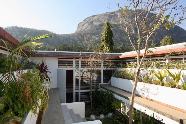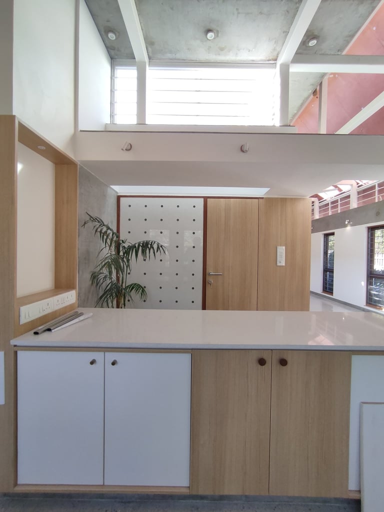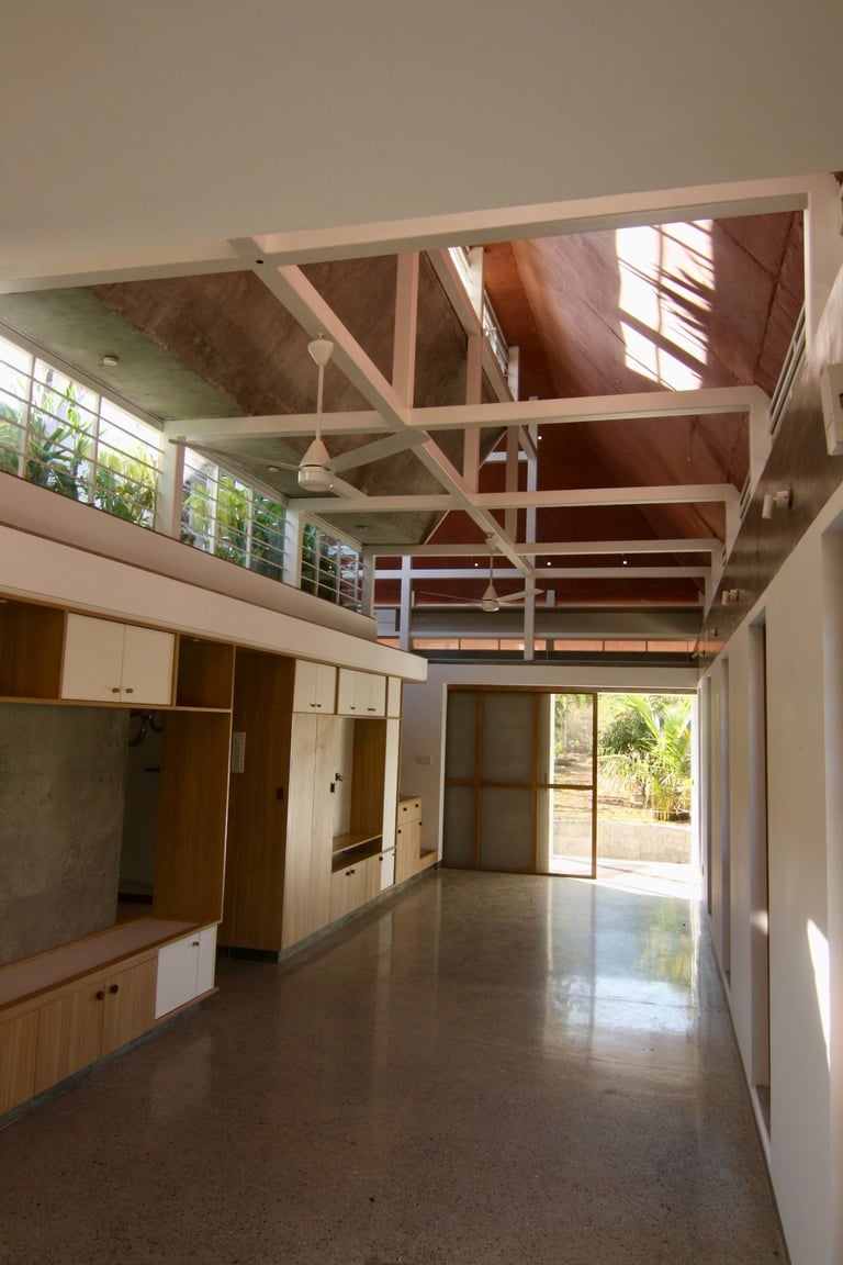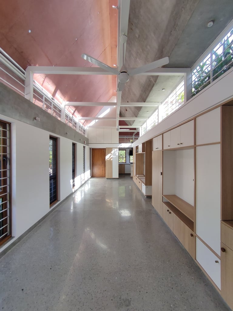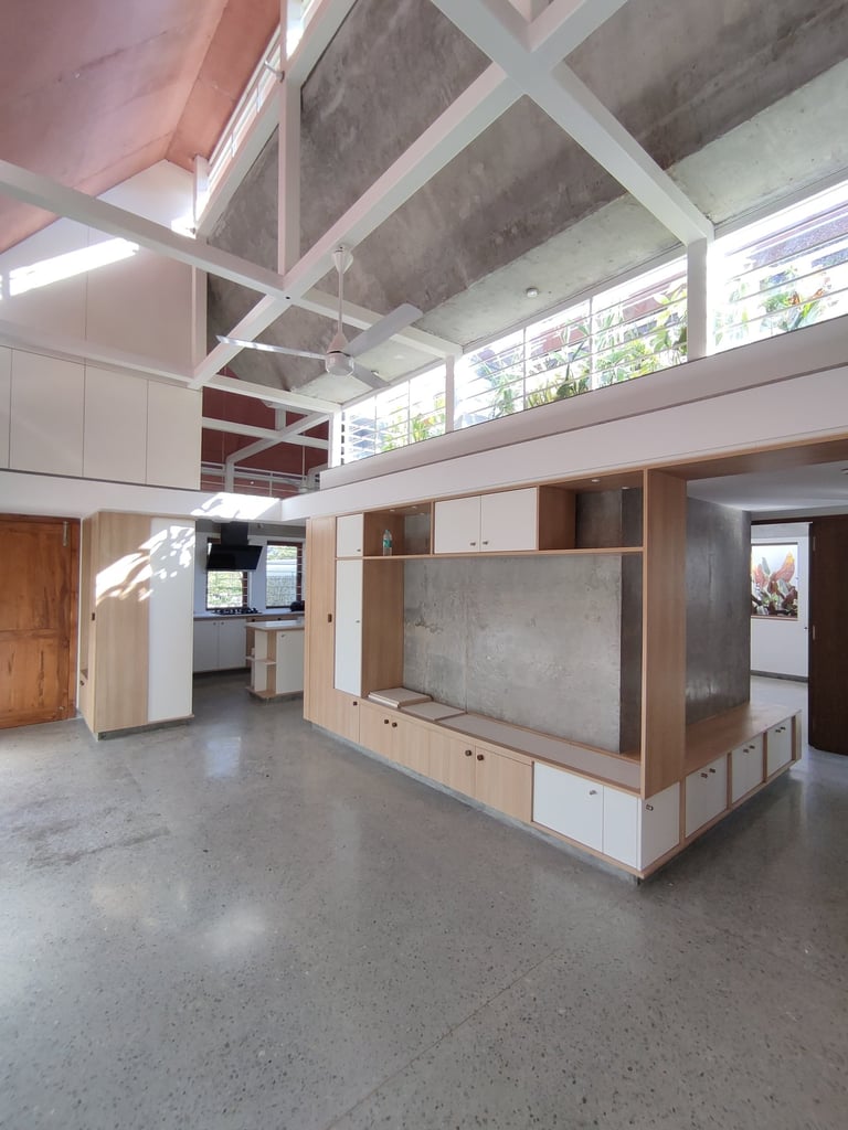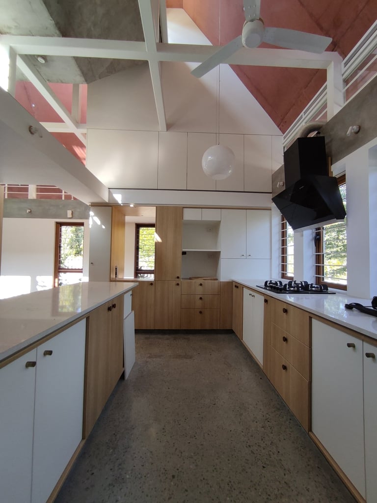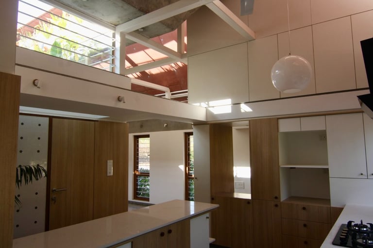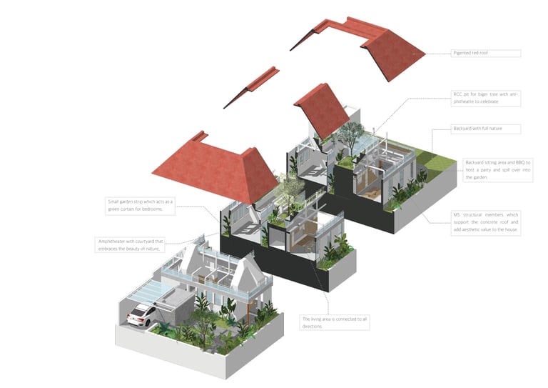 The Weekend House for the doctor harmoniously blends Kerala*s timeless architectural allure with contemporary aesthetics on a spacious plot. Responding to the doctor's vision, we partitioned the property, allocating half to a wild garden and crafting the remaining space into a modern residence. Our objective was to seamlessly modernize traditional Kerala style, evident in the substitution of Mangalore tiles with vibrant pigment red concrete and the exchange of wooden members for sleek metal steel MS sections. Elevating the design, the courtyard was strategically elevated to the first floor, visible from all angles, fostering a serene connection with nature. The house emanates a natural and soothing ambiance, embodying the perfect weekend retreat where traditional charm meets modern comfort for the doctor's respite.